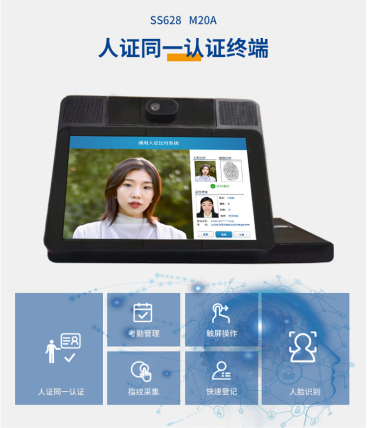 神思SS628-M20人證同一認(rèn)證終端可以讀取身份證信息,通過(guò)人臉識(shí)別,對(duì)于人臉做一個(gè)人證比對(duì),是一