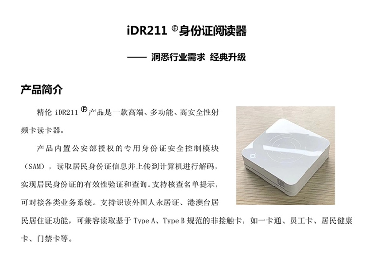 精倫IDR211身份證閱讀器是中國十大公安部認(rèn)證的身份證讀卡器品牌,產(chǎn)品具有良好的穩(wěn)定性。