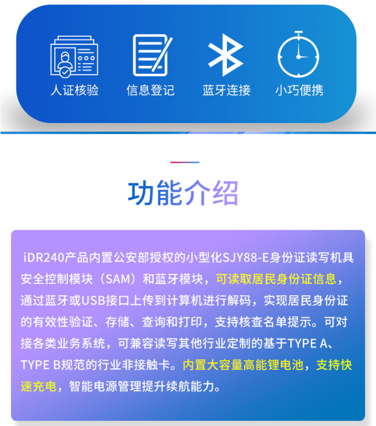 精倫Idr240產品是一款多功能射頻卡讀卡器,支持藍牙,有線雙端接入。產品內置公安部授權的身份證讀寫機具安全控制模塊(SAM)和藍牙模塊,可讀取居民身份證信息,通過藍牙或USB接口上床到計算機進行解碼,實現居民身份證有效性驗證,查詢和打印,支持核查名單提示。可對接各類業務系統,可兼容讀寫基于TypeA,TypeB規范的行業非接觸卡。內置大容量高能鋰電池,支持快速充電,只能電源管理提升續航能力。